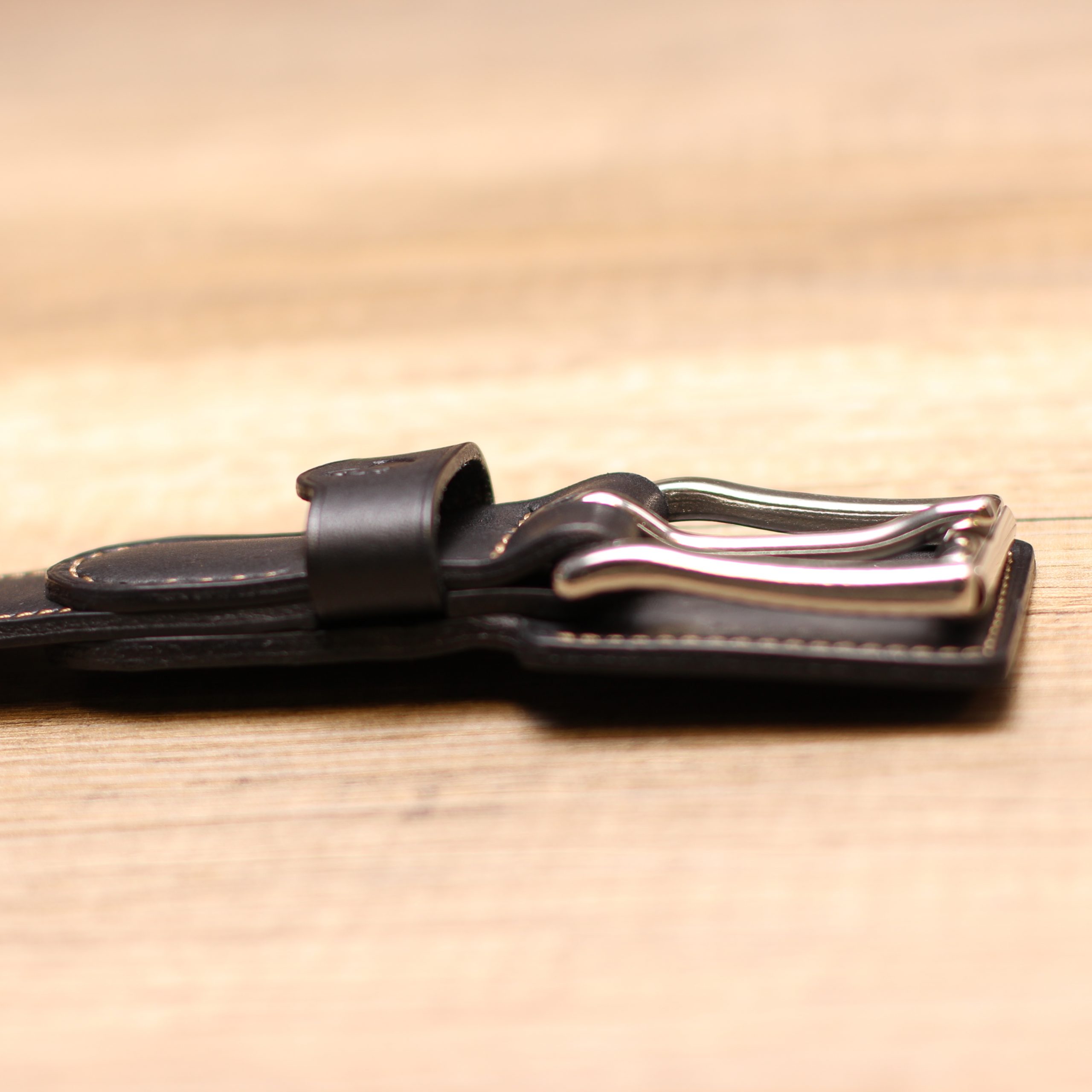 Die Konstruktion dieses Gürtels enthält ein zusätzliches Lederteil hinter der Schnalle, das nach derselben Technologie wie der gesamte Gürtel gefertigt ist