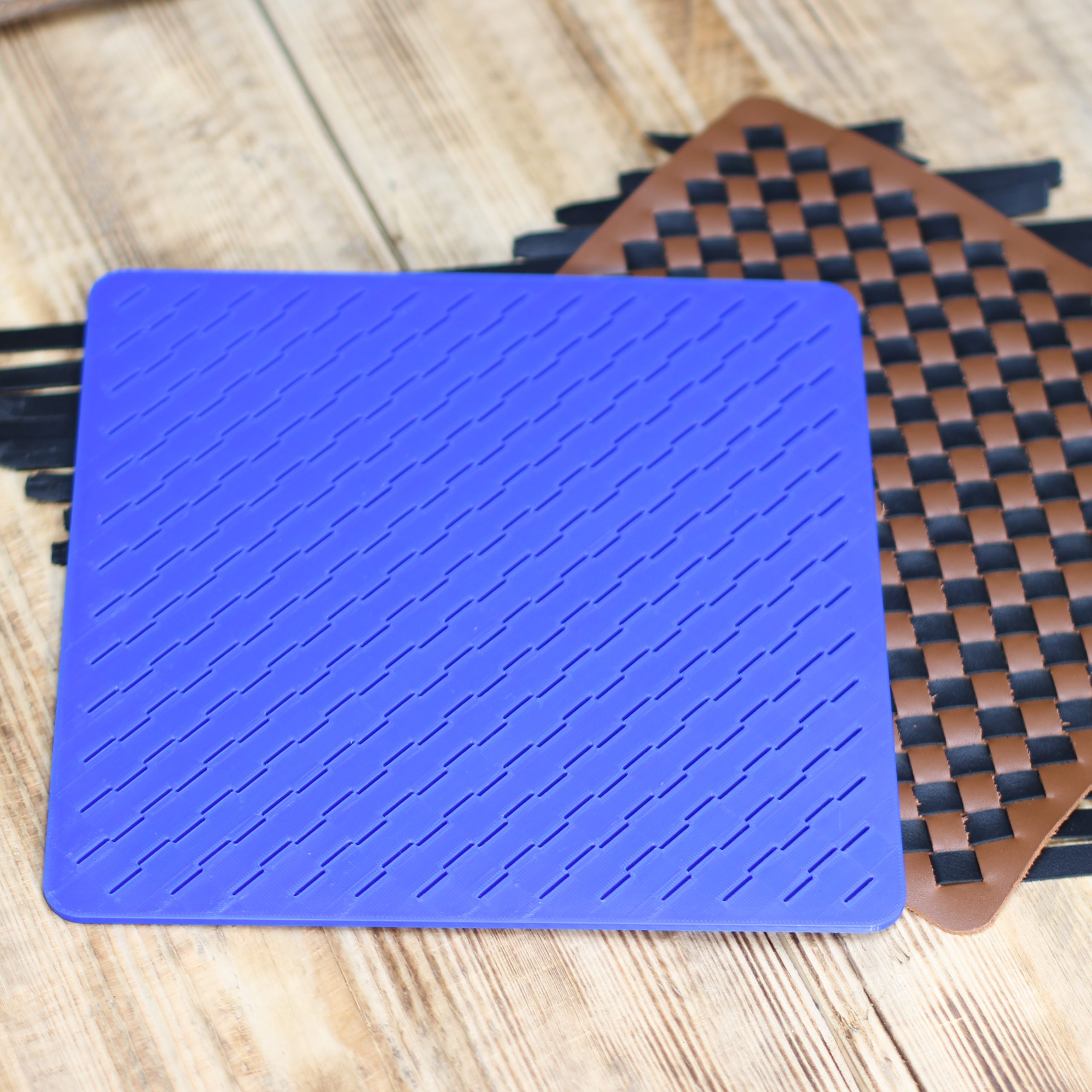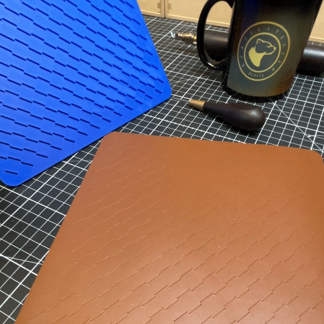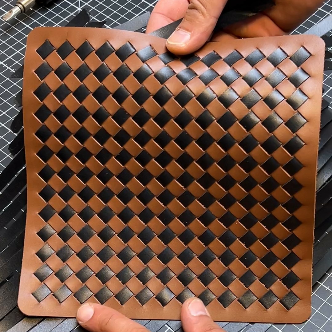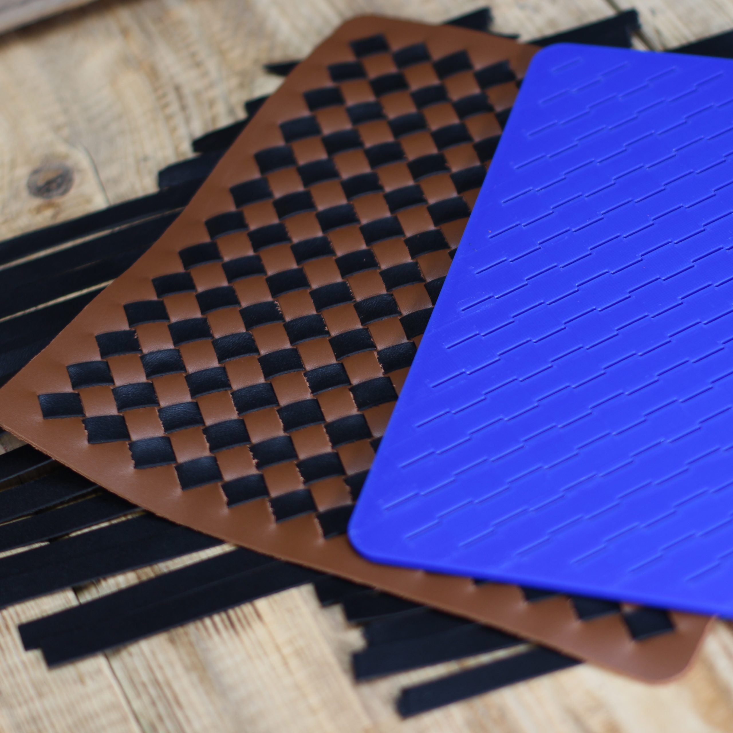 Diese Form dient zur Herstellung der Basis für Handtaschen und Clutches. Die Fläche beträgt ca. 210 x 208 mm und ist mit Löchern (Schlitzen) zum Einweben von 10 mm breiten Lederstreifen versehen. Diese Löcher (Schlitze) werden mit einem 10 mm x 1 mm großen Schlitzstanze hergestellt. Wir empfehlen die Verwendung von 1,2 mm dickem Leder.