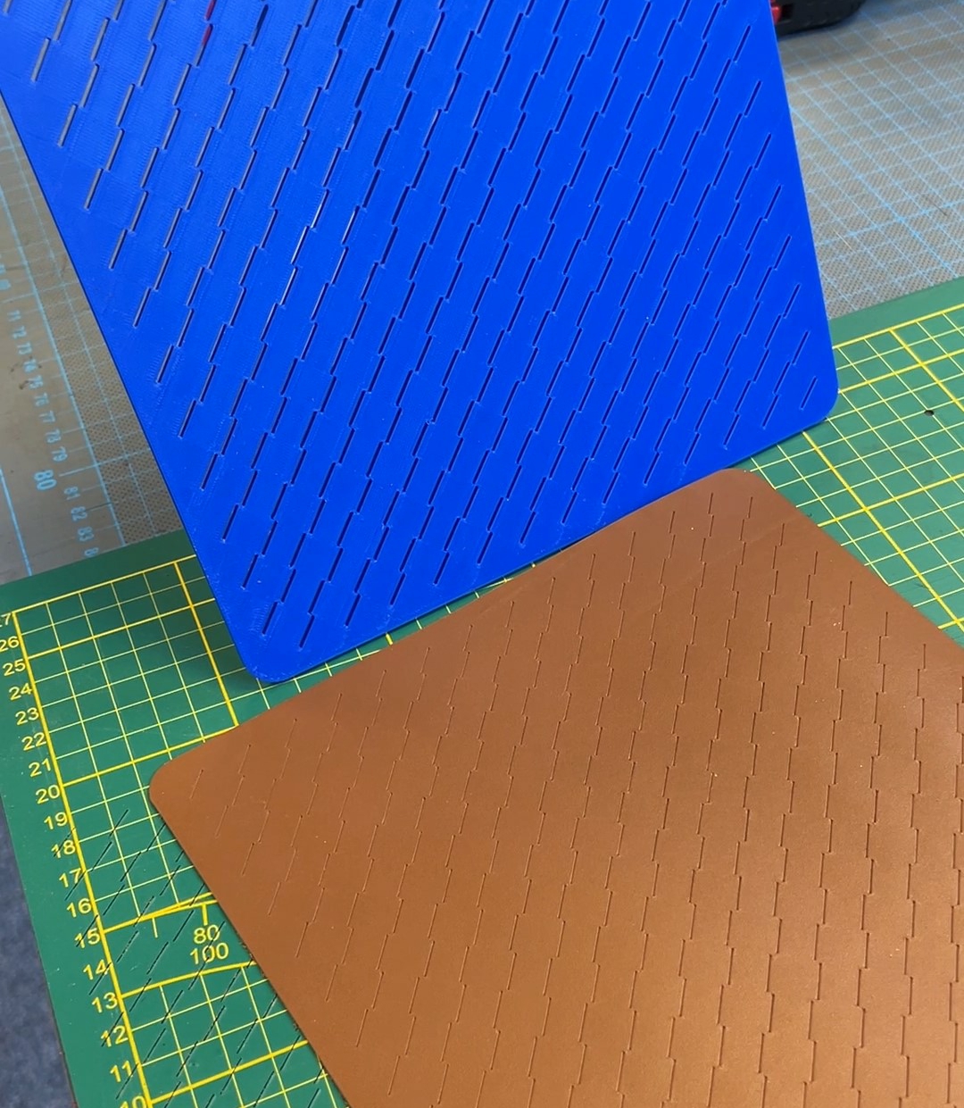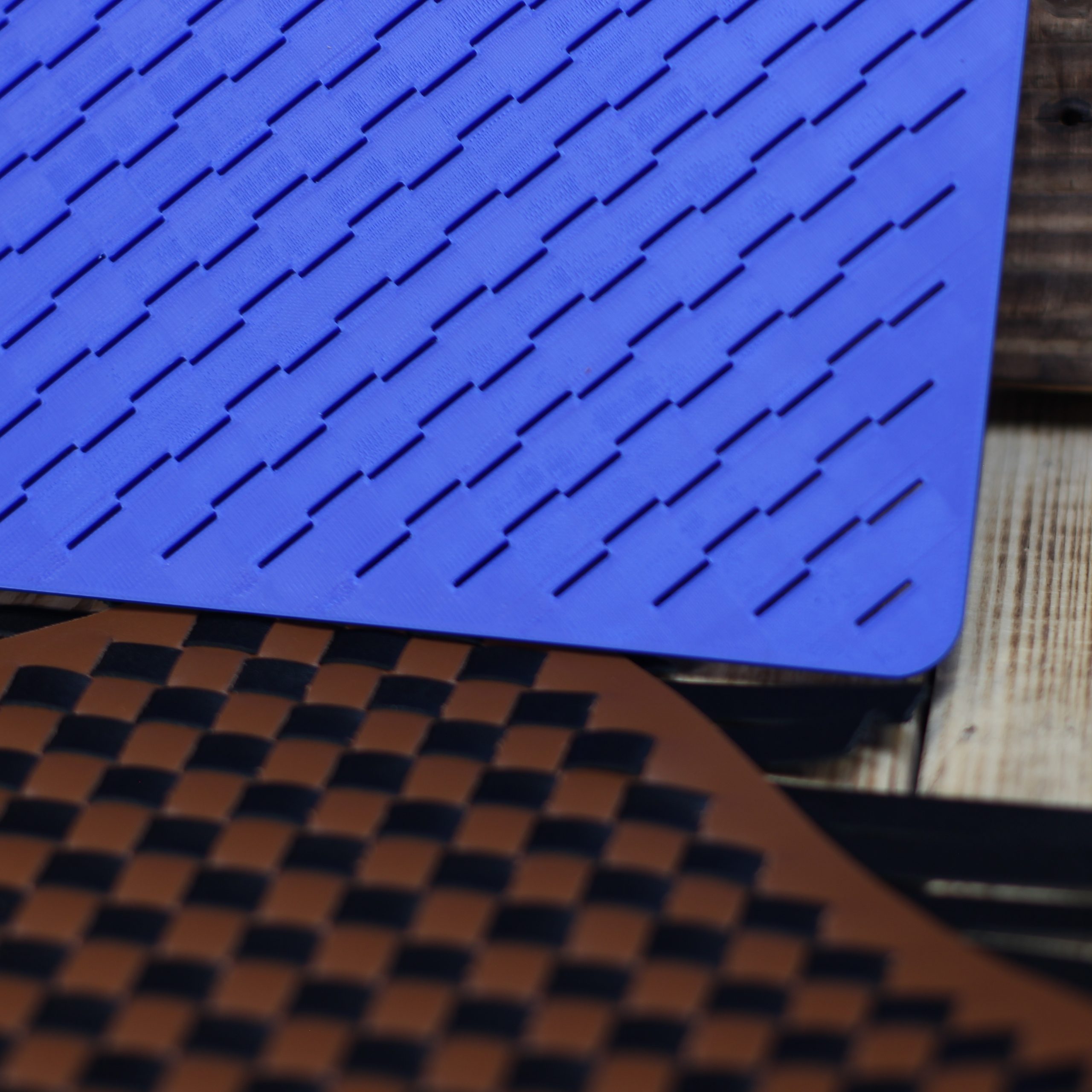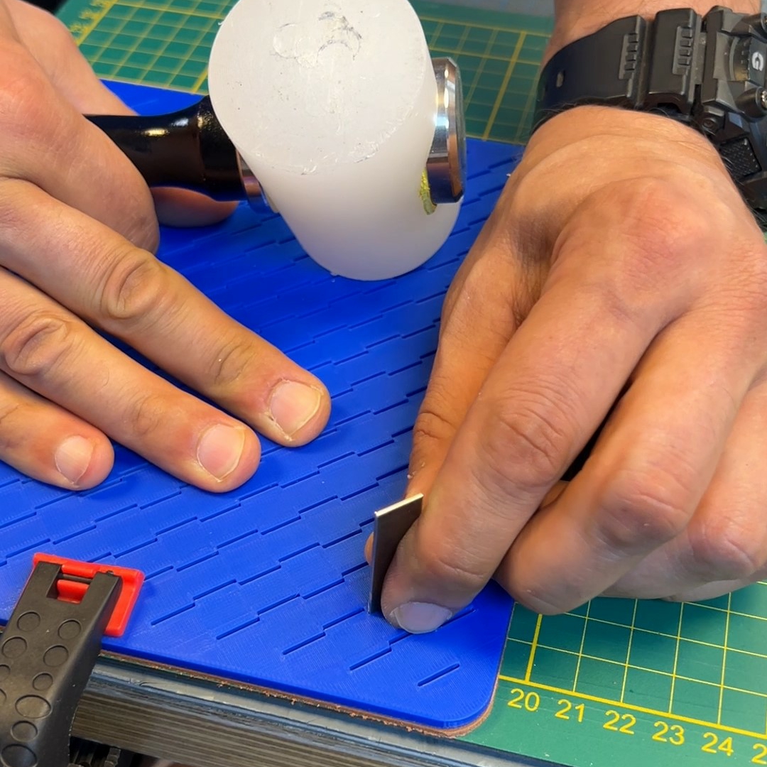 Diese Form dient zur Herstellung der Basis für Handtaschen und Clutches. Die Fläche beträgt ca. 210 x 208 mm und ist mit Löchern (Schlitzen) zum Einweben von 10 mm breiten Lederstreifen versehen. Diese Löcher (Schlitze) werden mit einem 10 mm x 1 mm großen Schlitzstanze hergestellt. Wir empfehlen die Verwendung von 1,2 mm dickem Leder.